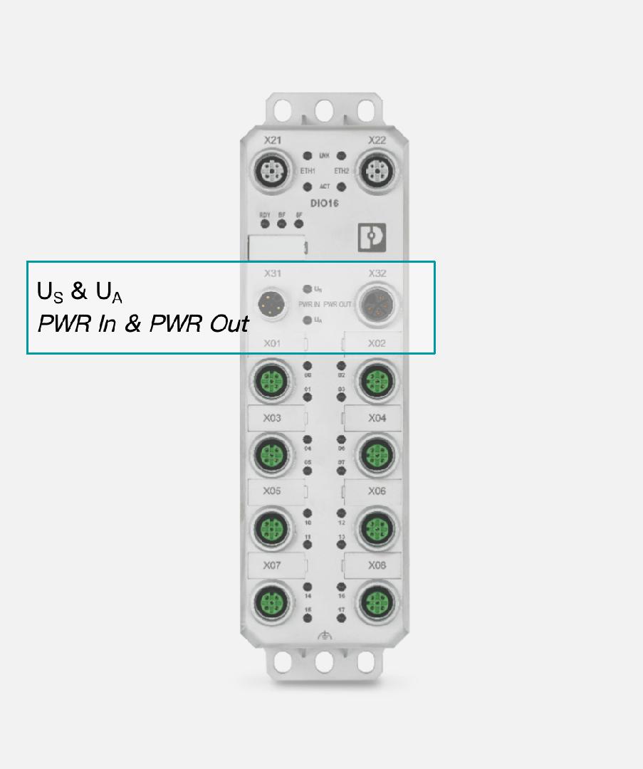 電源供電使用M12螺紋連接器,L型編碼,供電電流可達16A,