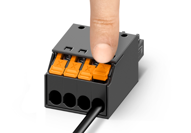 退線過程同樣無需使用任何工具,只需完全摁下橙色杠桿復(fù)位彈簧機構(gòu),即可快速釋放導(dǎo)線,蓄勢待發(fā)準(zhǔn)備下一次連接。