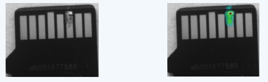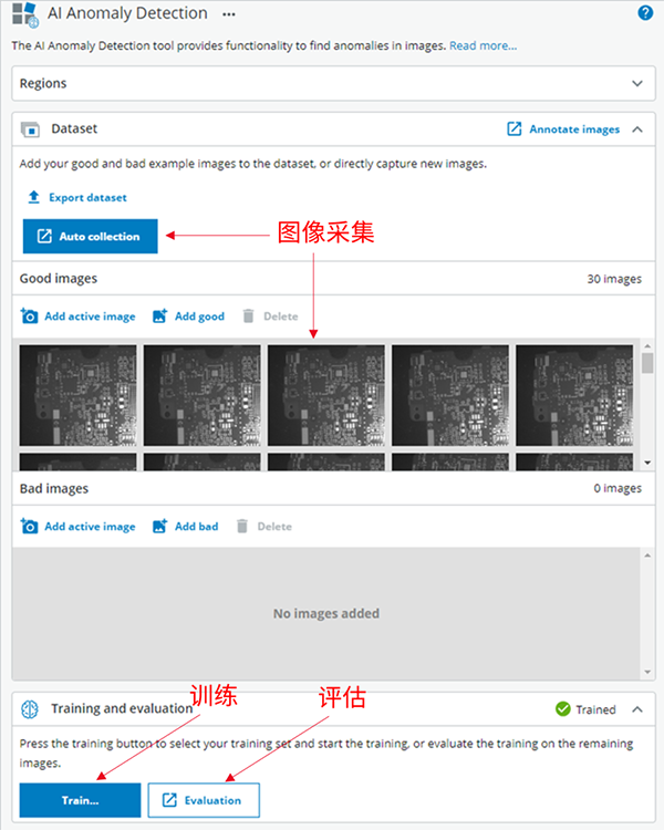 在智能相機設(shè)備中只需要訓(xùn)練無缺陷的圖像即可,總數(shù)最多為100張,訓(xùn)練時間最快30秒以內(nèi)。有缺陷的圖像只用于評估,并自動給出區(qū)分好壞的閾值。
