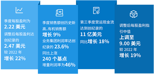 公司將全年有機(jī)增長(zhǎng)指導(dǎo)目標(biāo)調(diào)整至11%至12%,中間值上調(diào)了50個(gè)基點(diǎn),并將調(diào)整后每股收益指導(dǎo)目標(biāo)上調(diào)至8.95美元至9.05美元,中間值上調(diào)了0.25美元。公司還將全年?duì)I運(yùn)現(xiàn)金流指導(dǎo)目標(biāo)上調(diào)到33億至37億美元,中間值上調(diào)1億美元。對(duì)于2023年第四季度,公司預(yù)計(jì)有機(jī)增長(zhǎng)率為8%-10%,調(diào)整后每股收益為2.39美元至2.49美元。