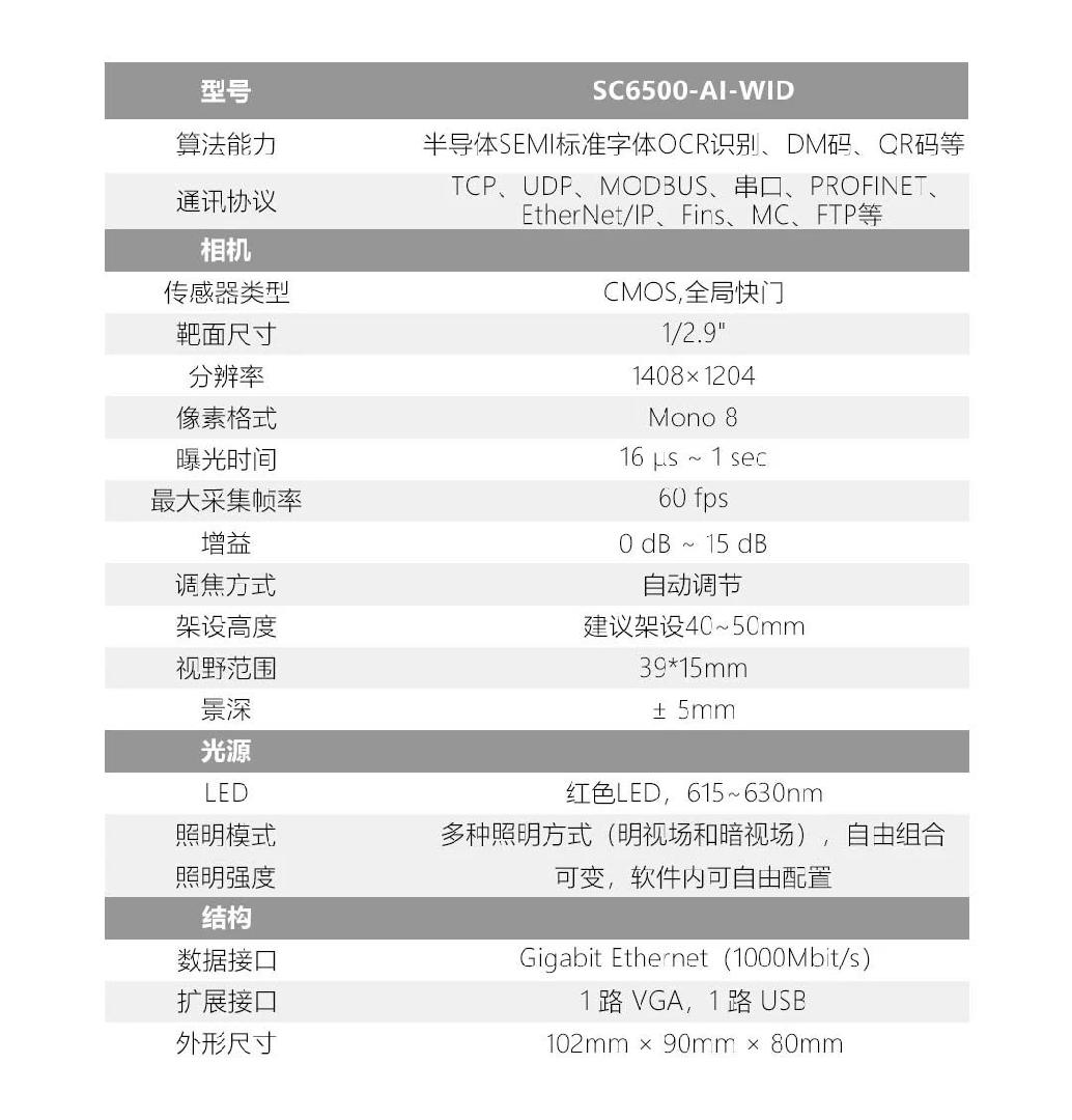 SC6500-AI-WID集成了專為硅片、晶圓識別而設(shè)計和開發(fā)的光學成像系統(tǒng),該系統(tǒng)為不同工藝設(shè)備端的晶圓ID識別提供了最佳的成像效果。