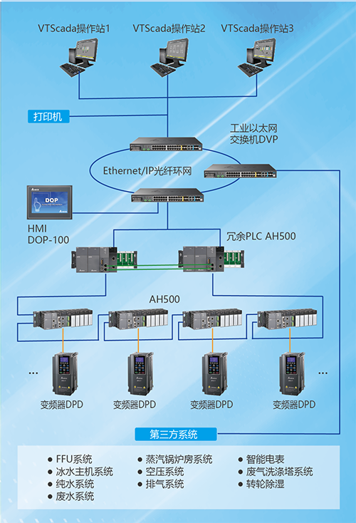 3、應(yīng)用冗余型PLC AH500搭載變頻器DPD組成冗余控制系統(tǒng),實(shí)現(xiàn)對(duì)空調(diào)系統(tǒng)、冷卻水塔等第三方系統(tǒng)的數(shù)據(jù)與流量調(diào)節(jié);聯(lián)動(dòng)主監(jiān)控系統(tǒng),進(jìn)行精密控制,為潔凈室的調(diào)溫、調(diào)濕等提供精細(xì)化控制。
