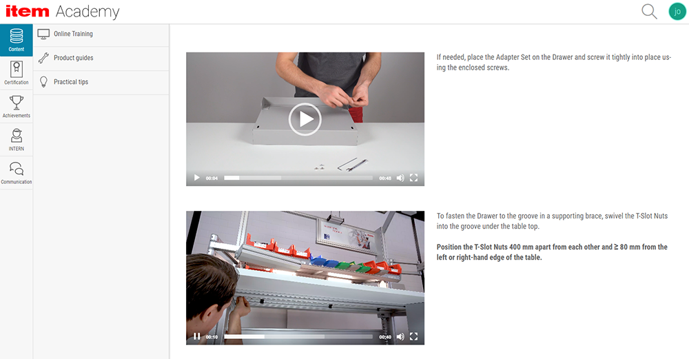 除了提供不同產(chǎn)品系列的安裝指南之外,item 在線培訓(xùn)平臺還包括各個產(chǎn)品的組裝指南,比如 MB 工業(yè)鋁型材裝配系統(tǒng)中的角件組件和 item 工作臺系統(tǒng)中的抽屜 S1 H70。平臺上的產(chǎn)品指南將幫助用戶一步步完成組裝,整個過程比產(chǎn)品手冊更快速、更有針對性。