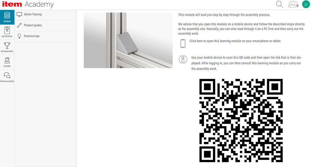 item 在線培訓(xùn)平臺的所有產(chǎn)品指南都經(jīng)過優(yōu)化。每個產(chǎn)品指南都擁有一個二維碼,使用平板電腦或智能手機(jī)掃描二維碼,可直接打開產(chǎn)品指南。這樣就能在工作臺上通過移動終端設(shè)備查看屏幕上的產(chǎn)品指南,親自操作短視頻中演示的步驟,并將自己的實際操作與視頻中的進(jìn)行對比。