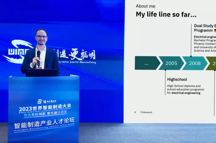 數(shù)智化變革提速對人才也提出了更高維度的要求,亟需培養(yǎng)多學(xué)科交叉復(fù)合型人才,以及政、產(chǎn)、學(xué)、研、用通力合作。12月7日下午,在大會同期舉辦的智能制造產(chǎn)業(yè)人才論壇中,菲尼克斯電氣數(shù)字化產(chǎn)品總監(jiān)S?ren Volgmann以親身經(jīng)歷為例,帶來了雙元制教育人才培養(yǎng)實(shí)踐演講。