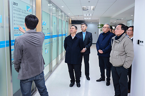 湖北省臺辦主任程良勝(左二)、武漢市臺辦主任劉紅鳴(左四)參觀臺達(dá)武漢研發(fā)中心新樓,了解臺達(dá)研發(fā)發(fā)展歷程。