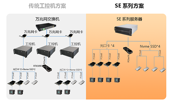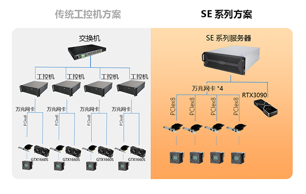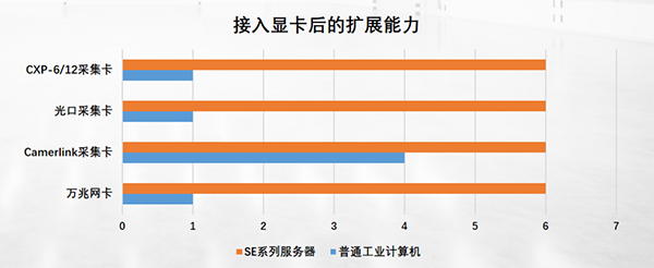 應(yīng)對需要同時處理多張采集卡數(shù)據(jù)的應(yīng)用時,由于傳統(tǒng)工控機自身擴展槽數(shù)量和顯卡厚度等因素限制,未能滿足需要的擴展性能;而SE系列服務(wù)器其特有的多卡插槽特性和獨特槽位設(shè)計,能夠在規(guī)避顯卡遮擋的同時提供至多擴展6個PCIex8卡槽的采集卡。