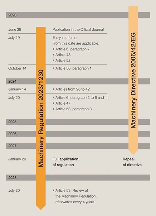 為應(yīng)對(duì)歐洲數(shù)字化互聯(lián)智能化機(jī)械的技術(shù)演進(jìn)趨勢(shì),歐盟發(fā)布了新的機(jī)械安全法規(guī)Machinery Regulation(EU)2023/1230,它將取代現(xiàn)行的歐盟機(jī)械指令2006/42/EC,成為機(jī)械安全方面最重要的法律法規(guī)。在經(jīng)過(guò)42個(gè)月的過(guò)渡期后,該法規(guī)將于2027年1月強(qiáng)制執(zhí)行。