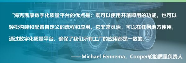 Cooper輪胎部署的是??怂箍倒I(yè)軟件旗下QMS數(shù)字化質(zhì)量平臺,來管理電子文件控制。隨著公司發(fā)展,Cooper輪胎希望質(zhì)量平臺能夠處理更多的系統(tǒng)問題,如全球各地的內(nèi)部設(shè)計(jì)驗(yàn)證。和許多剛開始數(shù)字化質(zhì)量管理轉(zhuǎn)型升級的公司一樣,Cooper輪胎公司使用電子郵件,或者利用SharePoint存儲(chǔ)的文檔,來管理生產(chǎn)過程的透明度、可見性、可追溯性,以及質(zhì)量檢查和標(biāo)準(zhǔn)合規(guī)性。