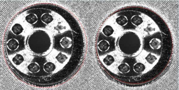 手動(dòng)抓取表面特征圓(偏差大)、AI抓取表面特征圓(準(zhǔn)確)