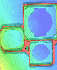 相比于傳統(tǒng)雙相機(jī)對頭拼接架設(shè)消除盲區(qū)的方式,雙目單線型號3D激光輪廓傳感器可獨(dú)立實(shí)現(xiàn)此功能,同時(shí)不受外部拼接標(biāo)定誤差影響,可進(jìn)一步降低項(xiàng)目成本和項(xiàng)目實(shí)施復(fù)雜度,提升檢測精度。