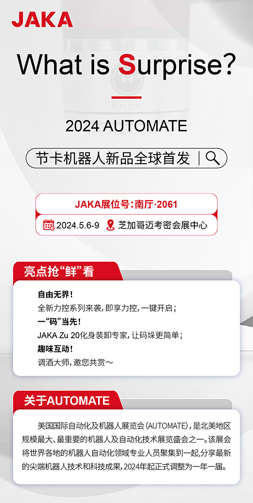 2024年5月6-9日,2024年美國芝加哥國際自動化及機器人展覽會(AUTOMATE)在芝加哥邁考密會展中心盛大開展。節(jié)卡機器人(展位號:南廳 2061)煥新而來,攜全新JAKA S系列協(xié)作機器人及其集成的焊接應用重磅亮相。此外,節(jié)卡機器人攜手JAGCO、HESCO、Triple等合作伙伴帶來的螺釘鎖附、搬運、CNC上下料、IP68高防護等級展示等工業(yè)智能應用表現(xiàn)卓越,引發(fā)專業(yè)參展觀眾的認可。