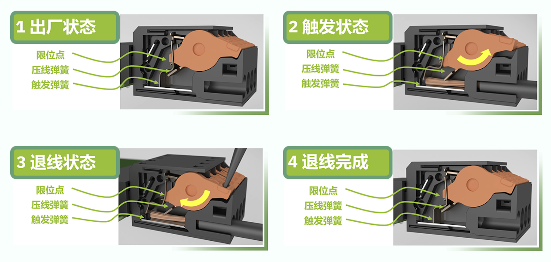 Push-X觸發(fā)式直插彈簧連接技術,內(nèi)置觸發(fā)式彈簧機構,出廠時內(nèi)部觸發(fā)彈簧已經(jīng)蓄能待發(fā),當導線插入觸發(fā)后,即可快速鎖緊導線,并伴隨清晰“咔噠聲”以及外部按鈕顯著抬升,提示接線到位;通過按鈕將觸發(fā)彈簧復位,即可高效輕松退線。